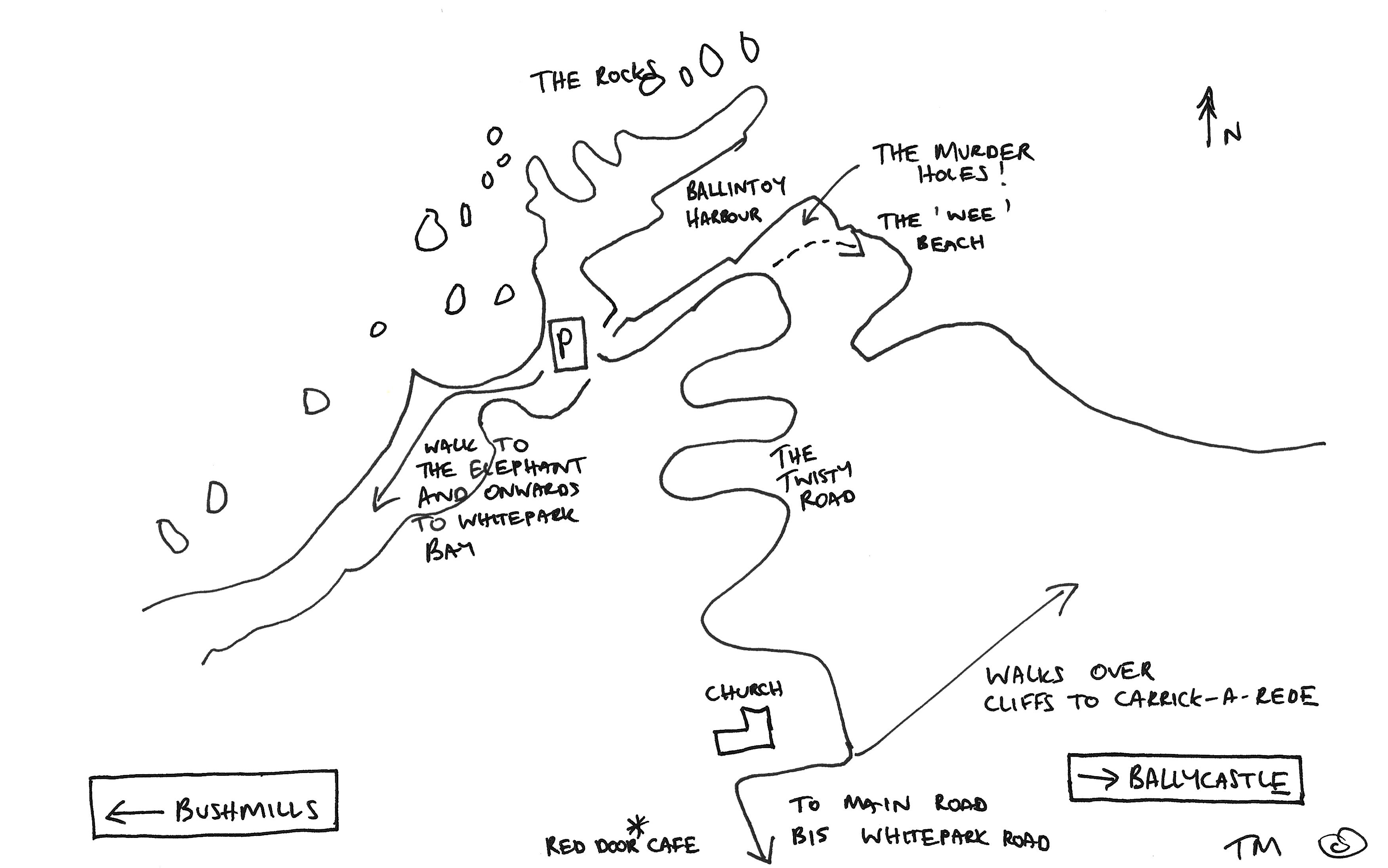 Walk 3: In the car park go and explore the big cave and then follow the path on the sea front round past the houses and continue on past the fossil beach, over the styles, through the old seaweed retting beds and the emergent stream (it emerges out of the rock) and then look out for the Ballintoy elephant. Take a few moments to explore the rocks in the sheltered beach and if the tides are ok – you can make it round the corner and onto one of NI’s best kept secrets – Whitepark Bay beach.