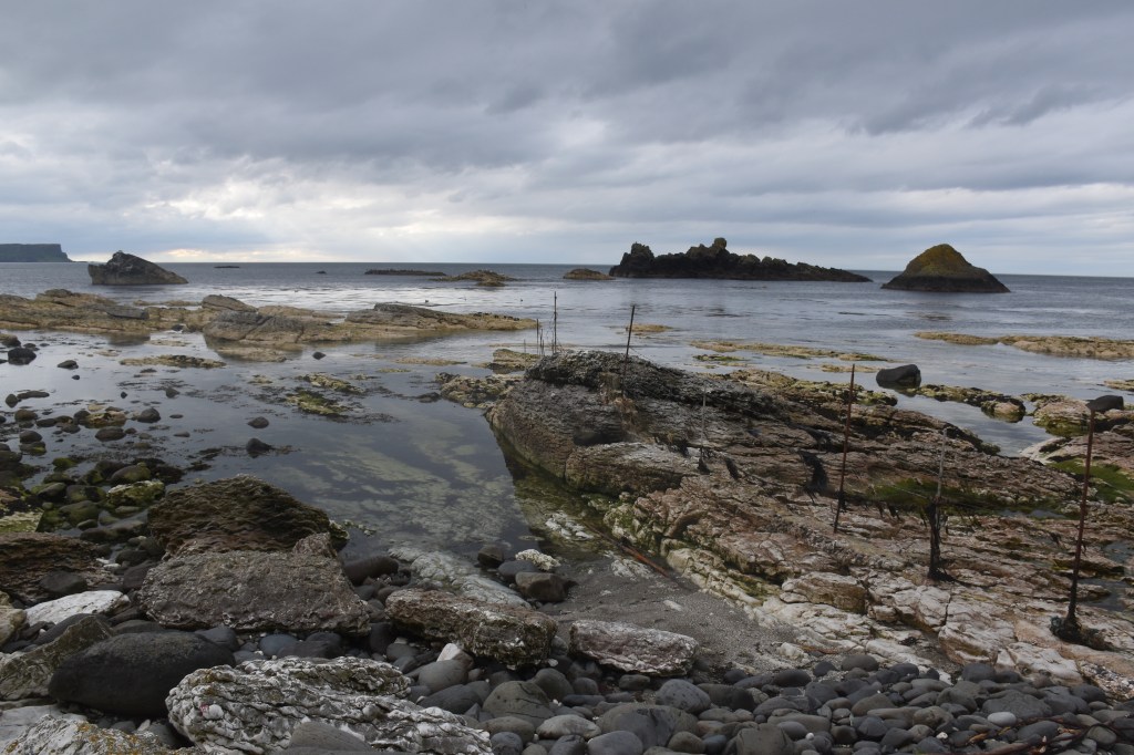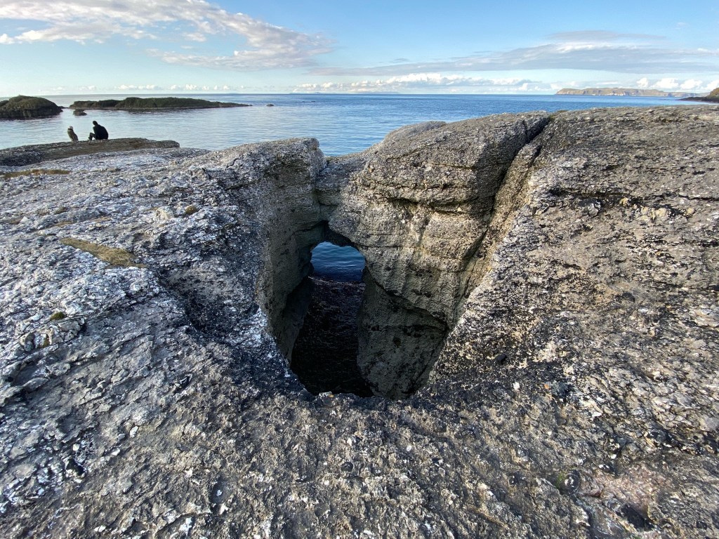 Walk 2: Go right on down to the bottom of the Twisty Road and park in the car park. Then, walk back up the road and go to the ‘wee’ beach on the right. There are quite a few limestone features and landforms to explore around the limestone pavement and the massive stack that is surrounded by a mighty wall of Basalt. Look out for what my kids call the eroded ‘murder holes’.